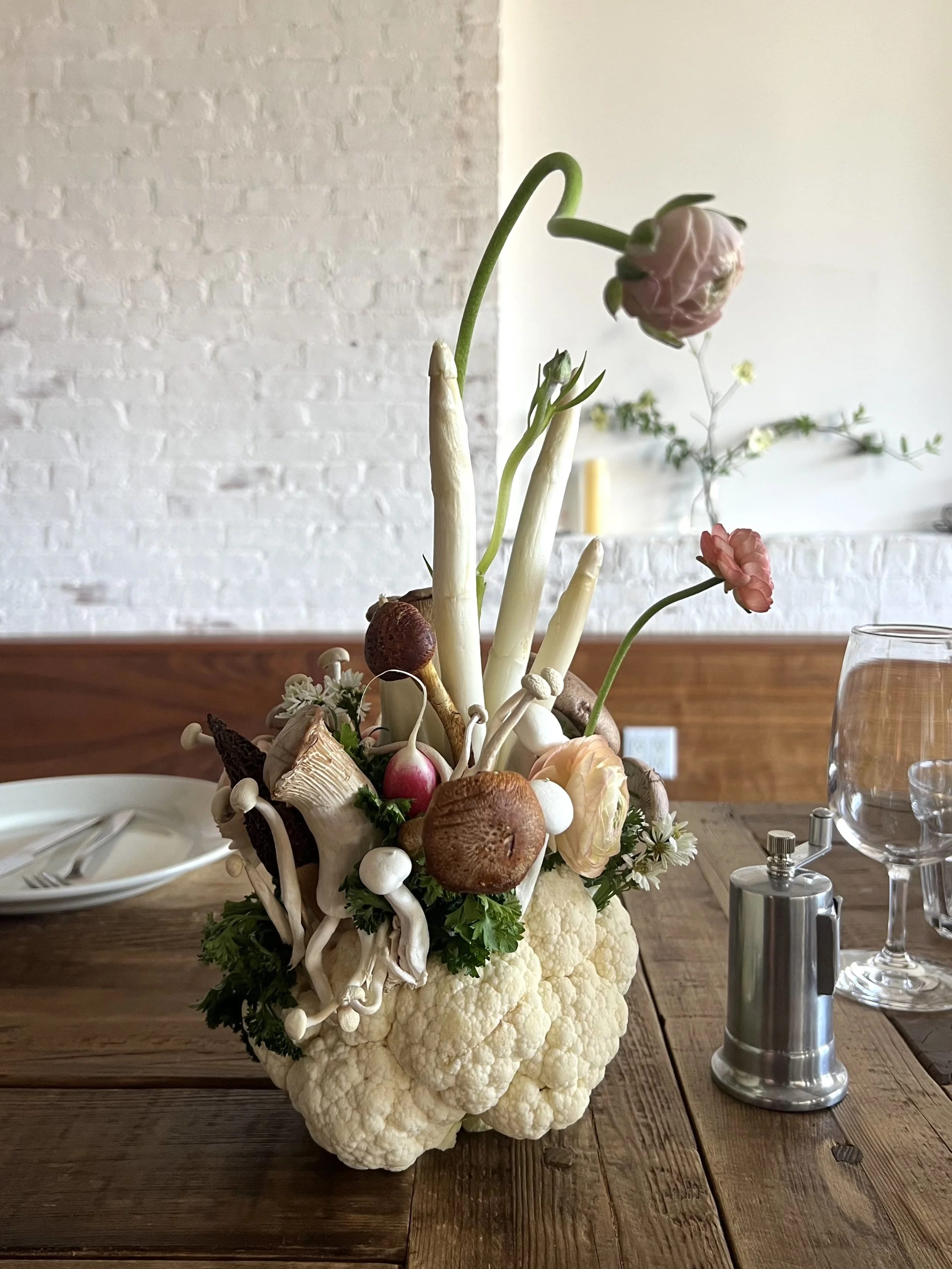 Inspired by the wonderful vegetable menu from Hetty McKinnon’s intimate Linger lunch series, a tablescape crafted from cauliflower, mushroom and asparagus was designed to complement the menu of seasonal salads.